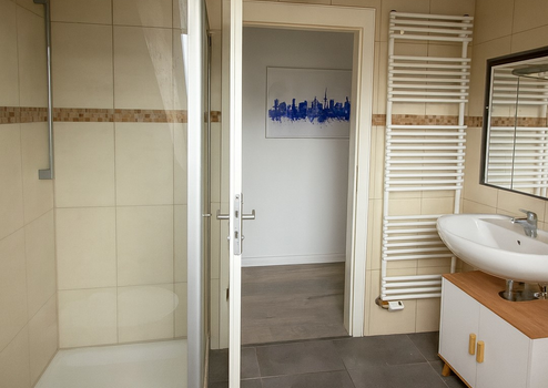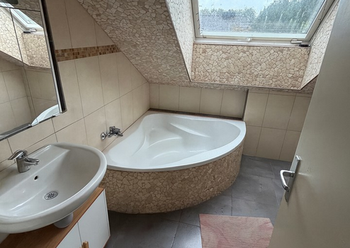 Das Obergeschoss bietet ein großes Vollbad mit eleganter Acrylwanne und separater Dusche, das durch seine Helligkeit und hochwertige Ausstattung überzeugt.