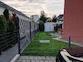 Garten mit großer Terrasse und Gartenhaus.