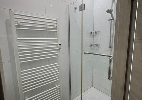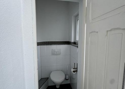 Im Badezimmer findet sich eine 90x90 Dusche mit Glastür. Das Gäste-WC mit Fenster ist vom Badezimmer getrennt.