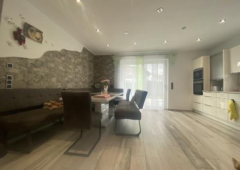 Beim Betreten des Hauses empfängt Sie ein einladender Eingangsbereich, der direkt in den großzügigen Flur führt. Von diesem aus gelangen Sie in alle Räume des Hauses. Blickfang ist hier die große Küche mit ansprechendem Essbereich. Die offene Gestaltung verbindet den Wohnbereich nahtlos mit der Küche. Der vorhandene Holzofen im Wohnzimmer sorgt für eine zusätzliche gemütliche Atmosphäre.