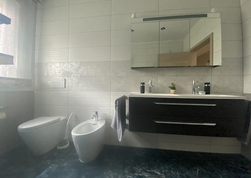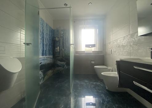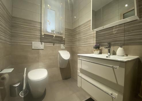 Das modern ausgestattete Badezimmer verfügt über eine großen bodengleiche Dusche. Zusätzlich gibt es ein Gäste-WC für mehr Komfort.