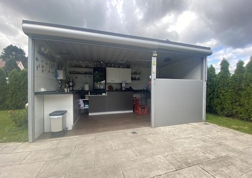 Der Außenbereich besticht durch eine großzügige Süd-West-Terrasse, die sich um das Haus erstreckt. Im Garten befindet sich eine erst kürzlich errichtete Sommerküche und ermöglicht kulinarische Erlebnisse im Freien. Diese eignet sich ideal für entspannte Stunden mit der gesamten Familie.