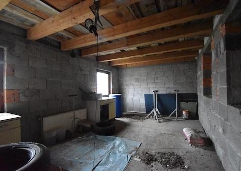 Scheune teilweise dreigeschossig, teilweise in Massivbauweise mit Hohlblockbetonsteinen (unverputzt), Decken aus Holz