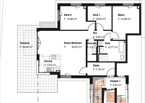 - flächendeckende Fußbodenheizung inkl. Raumthermostaten