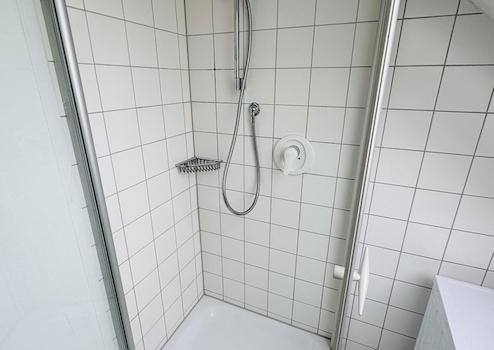- Badezimmer: Helles Tageslichtbad mit Duschkabine, Waschbecken, WC und einer bereits vorhandenen Waschmaschine.