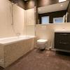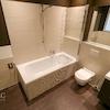 Das Badezimmer präsentiert sich zeitgemäß mit großformatigen Fliesen, Badewanne mit Glasabtrennung und wandhängendem WC. Ein Waschtisch mit Unterschrank bietet Stauraum, ein Handtuchheizkörper ist ebenfalls erkennbar. Ein Fenster sorgt für Tageslicht.