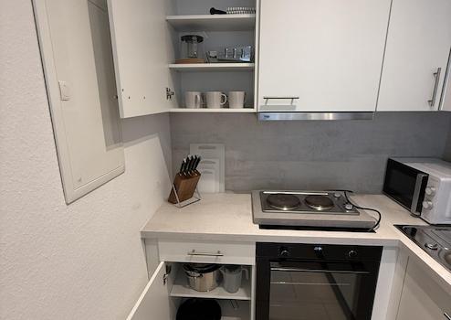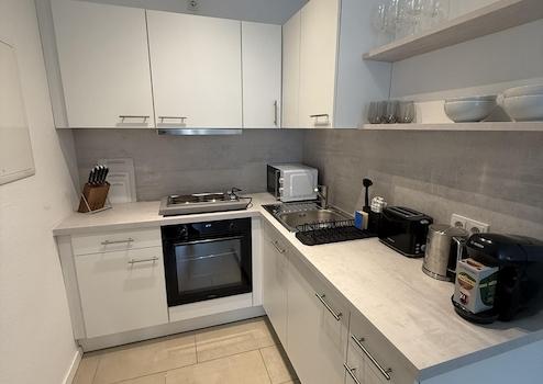 Die Küche ist vollständig ausgestattet und bietet eine sehr gute Grundausstattung für den täglichen Gebrauch. Sie verfügt über einen Kühlschrank sowie über Koch- und Backmöglichkeiten. Aufgrund von Lieferverzögerungen sind derzeit Übergangsgeräte für Herd und Backofen installiert, welche in den ersten Januarwochen durch neue Geräte ersetzt werden. Darüber hinaus sind Kaffeemaschine, Wasserkocher, Geschirr, Gläser, Besteck sowie umfangreiche Kochutensilien vorhanden, sodass eine eigenständige Nutzung der Küche problemlos möglich ist.