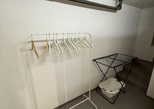 Das Badezimmer ist modern ausgestattet und verfügt über eine Dusche sowie Handtücher. Zusätzlich steht ein separater Kellerraum zur Verfügung, der unter anderem Platz für einen Wäscheständer und weitere persönliche Gegenstände bietet. Eine gemeinschaftliche Waschmaschine mit Münzbetrieb befindet sich ebenfalls im Keller.