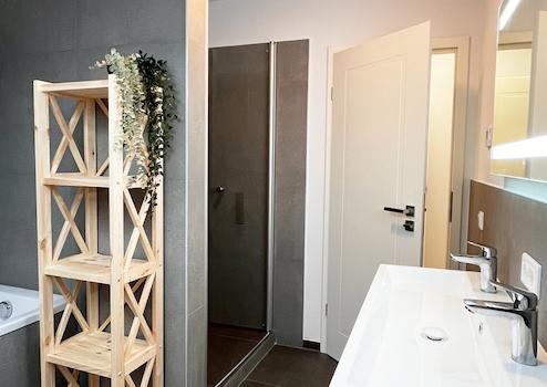 Bad mit Dusche und Badewanne. Separates WC mit Handwaschbecken.
