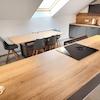 Die hochwertige Einbauküche (Kosten 15.000 €) mit Bora Kochfeld und Luftabzug ist offen gestaltet. Die große Kücheninsel kann perfekt als Theke genutzt werden und bietet sehr viel Stauraum.