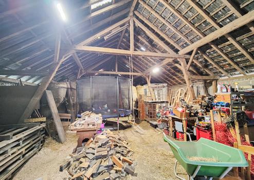 An das Wohnhaus grenzt ein großes Stallgebäude mit darüberliegender Scheune. Den Stall erreicht man auf kurzem Wege über einen Gang mit weiteren Lagerräumen. Hier befindet sich auch der Zugang zum alten Bruchsteinkeller.