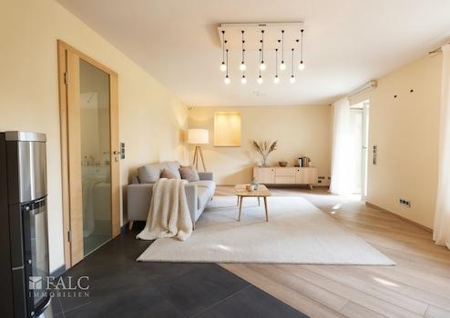 Der offen gestaltete Wohn- und Essbereich bildet im Erdgeschoss das Herzstück des Hauses und lädt mit seinem schwedischen Kaminofen zu behaglichen Stunden ein. Von hier aus besteht ein direkter Zugang zur Terrasse sowie in den einzigartigen Gartenbereich. Die angrenzende Küche ist mit einer hochwertigen Einbauküche ausgestattet und verfügt über die Möglichkeit einer gemütlichen Sitzgelegenheit.