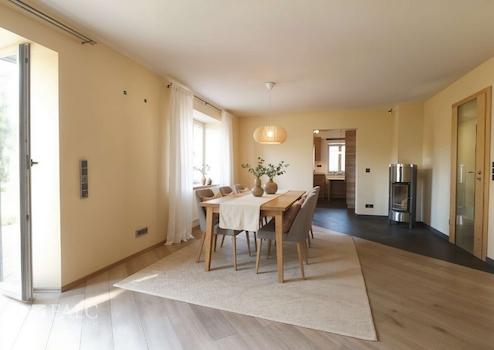 Schwedenofen, Echtholzdielenboden und Feinsteinzeugfliesen, Zugang zum Gartenbereich