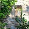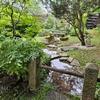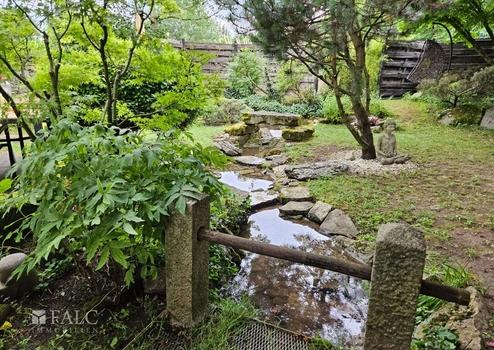 Der liebevoll angelegte japanische Garten wird im Osten und Westen von handgefertigten Natursteinmauern flankiert. Das Zentrum bildet ein pumpenbetriebener Bachlauf mit kleinem Wasserfall.
