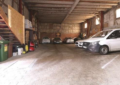 Aktuell befindet sich im Erdgeschoss des Nebengebäudes eine Parkebene mit sieben PKW-Stellplätzen. Sechs davon sind vermietet; ein weiterer Stellplatz mit Wallbox-Anschluss gehört zum noch vermieteten Wohnhaus.