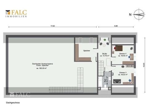 Das imposante Dachgeschoss des Nebengebäudes mit seinem historischen Dachgebälk kann zur Erweiterung der privaten Wohnfläche ausgebaut werden. Derzeit wird dieses als Speicherfläche genutzt.