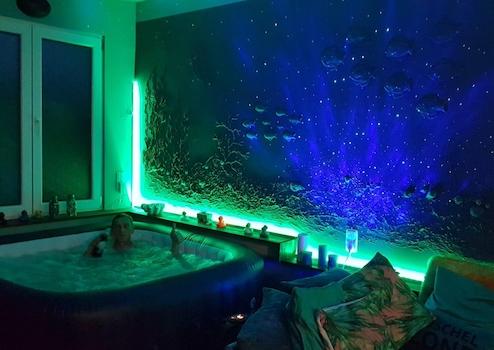 Ein weiteres außergewöhnliches Merkmal ist ein Gartenhaus, das mit einem Whirlpool sowie TV- und Internetanschluss ausgestattet ist. Hier kann man sich nach einem langen Arbeitstag entspannen und das ein oder andere Fußballmatch genießen.