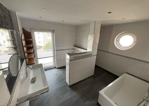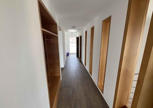 Eine Etage höher betritt man den Privatbereich der großen Wohnung/Hauptwohnung, was auf den ersten Blick etwas ungewöhnlich wirkt, sich aber in der Praxis angenehm wohnen lässt. So haben Sie auf dieser Ebene ein annähernd gleiches Badezimmer wie im Erdgeschoss. Der helle und freundliche Flur erstreckt sich in einer L-Form. Als nächster Raum ist der Abstellraum zugänglich, welcher zusätzlich auch ein Podest für die Waschmaschine und Wäschetrockner bietet. Das Eltern-Schlafzimmer sowie zwei weitere (Schlaf)-Räume lassen sich bequem einrichten. Im Eltern-Schlafzimmer ist ebenfalls ein Einbauschrank bereits vorhanden. Innentüren, Türzargen sowie auch die Einbauschränke sind in Echtholz ausgeführt. Diverse Austrittsmöglichkeiten lassen Sie auf den großen Balkon teilweise sichtgeschützt, austreten.