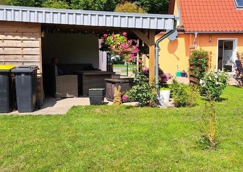 Im Garten bietet ein kleiner Carport einen geschützten Sitzbereich