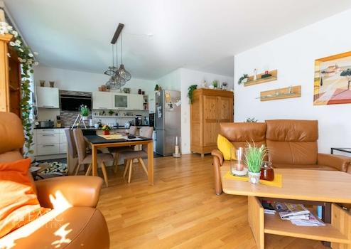 Das großzügig geschnittene Wohn- und Esszimmer bietet reichlich Platz zum Entspannen und zum Bewirten von Gästen. Die offen angeschlossene Küche ist hochwertig ausgestattet und lässt keine Wünsche offen: Siemens-Markengeräte wie Backofen mit Dampfgarerfunktion, Induktionskochfeld, Dunstabzugshaube, Geschirrspüler sowie ein Liebherr-Kühlschrank mit integrierter Eismaschine gehören zur Ausstattung und sind im Preis enthalten. Eine versenkbare, elektrische Brotschneidemaschine rundet das durchdachte Küchenkonzept ab.