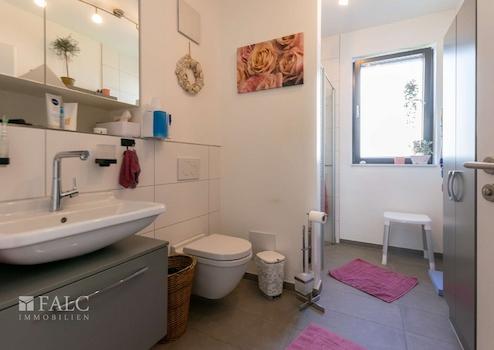 Das Tageslicht-Bad verfügt über eine begehbare Dusche mit Glastür, ein maßgefertigter Spiegelschrank über dem Waschbecken, ein WC sowie ein Handtuchwärmer sorgen für Komfort und Funktionalität. Das separate Gäste-WC ist mit einer elektrischen Dusch-WC-Funktion ausgestattet und bietet zudem Platz für Waschmaschine und Trockner. Beide Sanitärräume sind in einem eleganten Weiß-Grau gehalten, so dass Sie farbliche Akzente ganz nach Ihren Lieblingsfarben setzen können. Die jeweiligen Badmöbel sind bereits im Preis enthalten.
