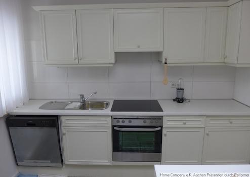 Voll ausgestattete Küche mit Ceranfeld, Backofen, Geschirrspülmaschine und großem Kühl- und Gefrierschrank, Waschmaschine in der Wohnung