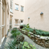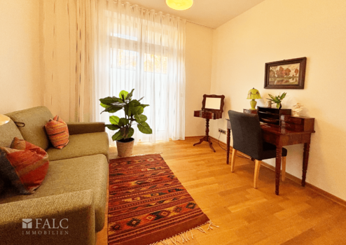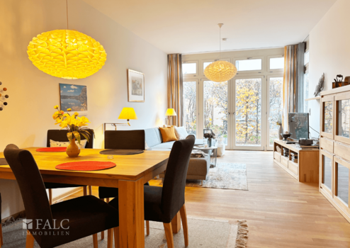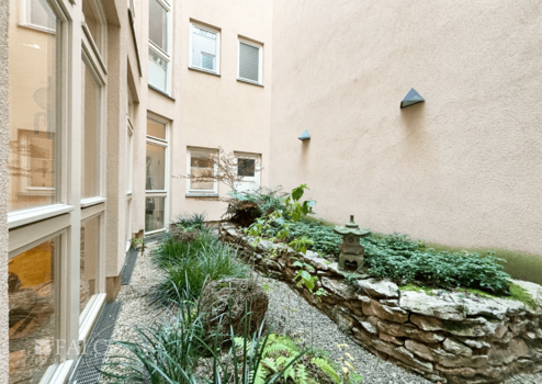 aufwändig restaurierte Wände, angenehme Raumtiefen, eine ruhige Selbstverständlichkeit. Gleichzeitig öffnet sich der Wohnraum zur geschützten Terrasse im Innenhof – ein Ort, der Ruhe ausstrahlt und den Alltag entschleunigt.