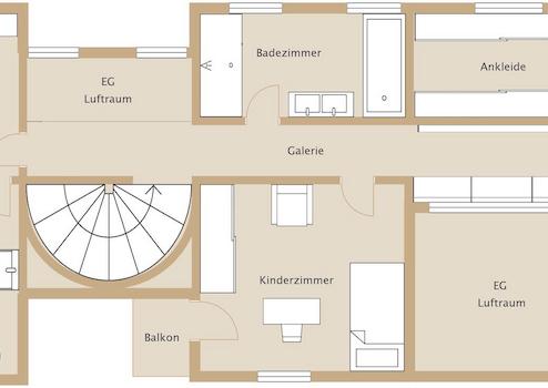 Im Obergeschoss ergänzen eine Galerie, eine großzügige Master-Suite sowie drei weitere flexibel nutzbare Räume das vielfältige Raumangebot.
