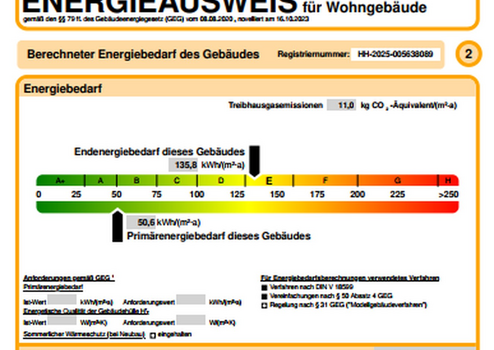 Der Energieausweis stammt vom 20.03.25 und ist gültig bis zum 20.03.2035. Der Energiebedarf liegt zwischen den Klassen D und E und entspricht dem Durchschnitt des Wohngebäudebestandes in Deutschland. Der Primärenergiebedarf liegt zwischen den Klassen A und B.