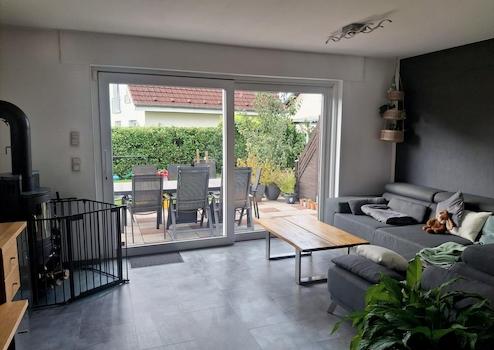 * Gartenebene (Untergeschoss): Hier befindet sich das gemütliche Wohnzimmer, das durch einen Kaminofen besonders in der kalten Jahreszeit für wohlige Wärme sorgt. Von hier aus gelangen Sie direkt in den gepflegten Garten. Eine neue elektrische Markise mit ausfahrbarem Volant (2024) sorgt im Sommer für angenehmen Schatten auf der Terrasse. Ein praktischer Kellerraum bietet zusätzlichen Stauraum.