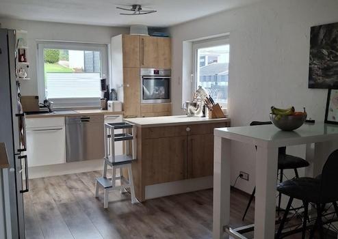 * Eingangsebene (Erdgeschoss): Beim Betreten des Hauses empfängt Sie ein heller Flur, der direkt in das Herzstück der Etage führt: Die offene Küche mit angrenzendem, großzügigem Essbereich – ideal für gemeinsame Abende mit Familie und Freunden. Die Küche kann übernommen werden. Angrenzend befindet sich ein gepflegtes Gäste-WC mit Waschtisch.