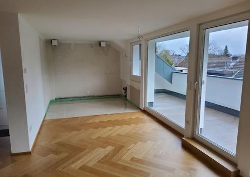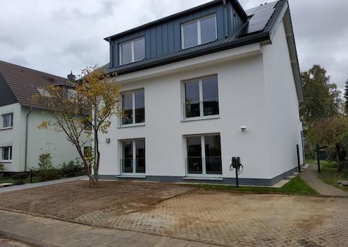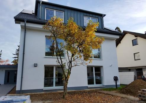 Ein großzügiges Dreifamilienhaus in einer gewachsenen Lage wurde mit höchstem Komfort und höchstem Effizienzhaus-Standard ausgestattet, Sie ziehen als Erste ein. Von der zentralen Diele gelangen Sie in alle Räume. Zwei große Räume mit großen Fenstern können als Schlaf- oder Arbeitsräume genutzt werden. Das Bad ist mit hochwertigen Sanitäranlagen und einer bodengleich gefliesten Dusche ausgestattet. Der großzügige, lichtdurchflutete Wohnbereich ist offen mit der Küche und dem Essbereich verbunden. Eine Küchenplanung mit allen Anschlüssen für eine vollausgestattete Küchenzeile ist vorhanden. Die hochwertigen Parkettböden und die bodentiefen Fenster sorgen für ein modernes und helles Ambiente. Von der weitläufigen Loggia blicken Sie in die Gärten und zum nahen Wald. Über eine Treppe mit Holzstufen gelangen Sie zum ausgebauten Dachstudio. Dort können Sie ein weiteres großes Zimmer nach Ihren Bedürfnissen - privat oder beruflich - nutzen. Ein kleines WC ist dort ebenfalls vorhanden.