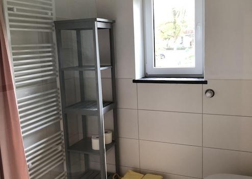 Das Bad mit Dusche und WC hat eine Fußbodenheizung und Handtüchtrockner.