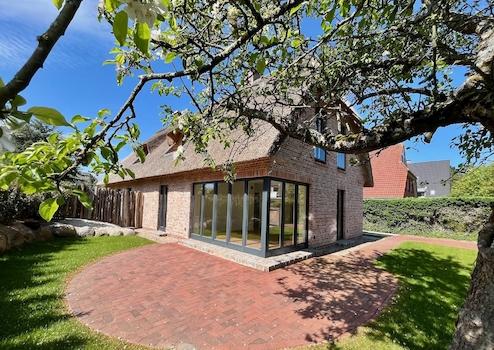 Exklusive Doppelhaushälfte unter Reet auf landschaftstypischen Grundstück mit Friesenwall, Terrasse & PKW-Stellplatz