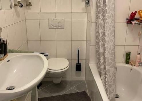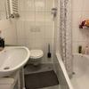 Das moderne helle Bad ist mit Wanne, Waschbecken, WC und Handtuchheizkörper ausgestattet.