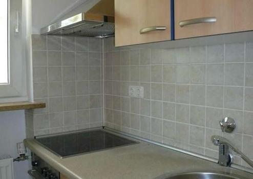 Die kleine abgeschlossene Küche mit Fenster ist mit einer Einbauküche mit Geschirrspüler eingerichtet. Ferner ist eine Kühlgefrierkombination und eine Mikrowelle vorhanden. Der Boden in der Küche, ist mit einem hochwertigen weißen Villeroy & Boch Keramik-Fließenboden ausgestattet.