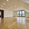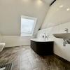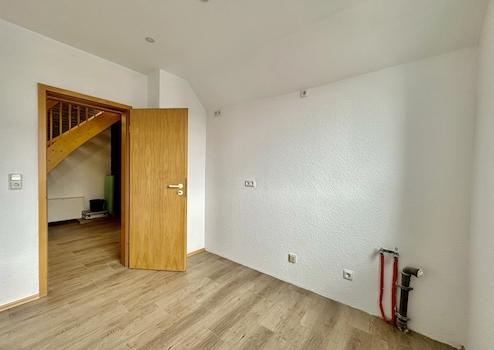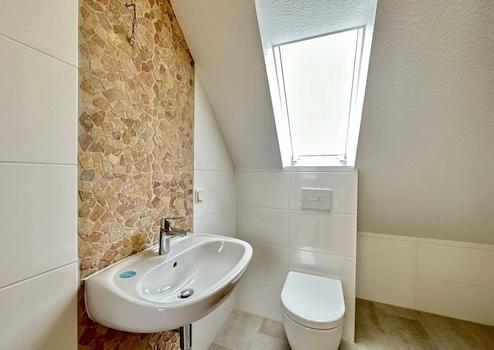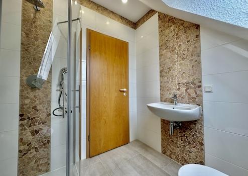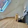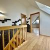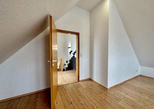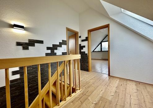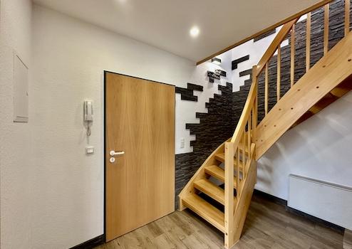 Vom Wohnungseingangsbereich aus gelangen Sie über eine Massivholz-Treppe in das Dachgeschoss und damit zu dem zweiten Badezimmer und dem großen Schlafzimmer.