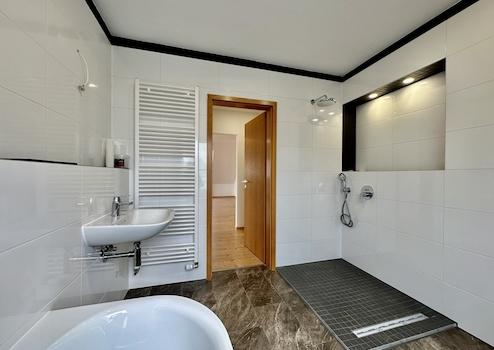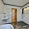 In der unteren Wohnebene befindet sich neben dem sehr geräumigen Wohnzimmer ein Arbeits- oder Kinderzimmer sowie das große Badezimmer mit Dusche und Badewanne.