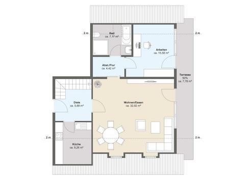 Vom Wohnzimmer und auch vom Arbeits- bzw. Kinderzimmer ist die ca. 15qm große Terrasse zu erreichen.