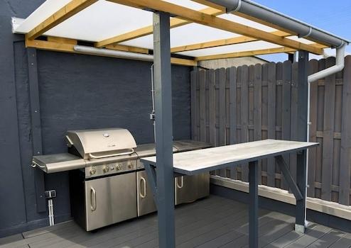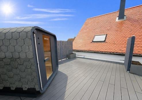 Ein besonderes Augenmerk lag auf der Neugestaltung der Außenbereiche: Die großzügige Dachterrasse wurde zu einem hochwertigen Wellness- und Freizeitbereich ausgebaut. Hier befinden sich eine Sauna, eine stilvolle Außendusche sowie eine voll ausgestattete Outdoor-Küche, die sowohl für entspannte Stunden als auch für gesellige Abende ideal geeignet ist. Ergänzt wird dies durch eine zweite, geschützte Terrasse, die zusätzlichen Platz für Aufenthalt im Freien bietet.