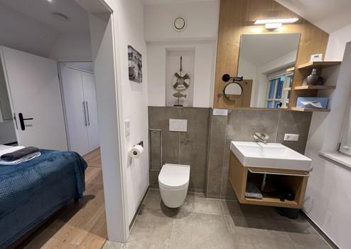 Der Eingangsbereich besteht aus alten originalen Spiekeroog-Pflastersteinen und geleitet Sie zur Echtholz- Eingangstür mit elektronischem Schloss - Schlüssel verlieren gehört somit der Vergangenheit an.
