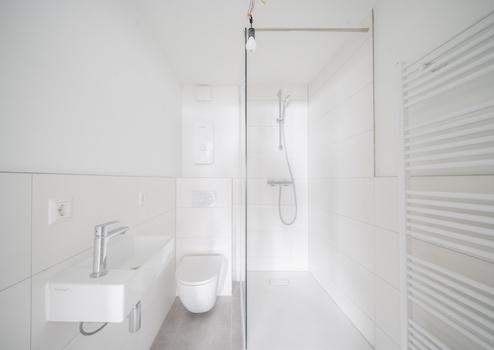 Das Badezimmer ist ein echtes Highlight: modern gefliest, mit stilvoller Dusche, neuen Armaturen und Tageslicht – hier fängt der Tag gut an!