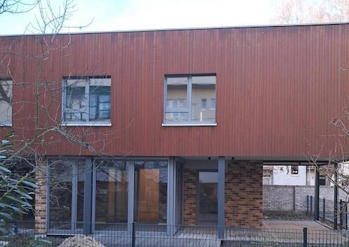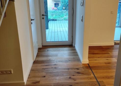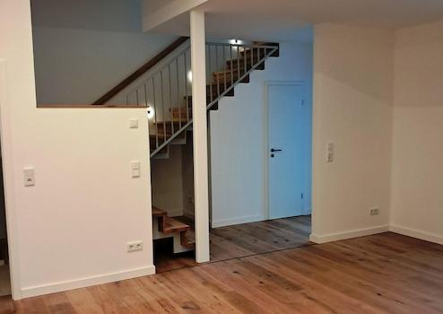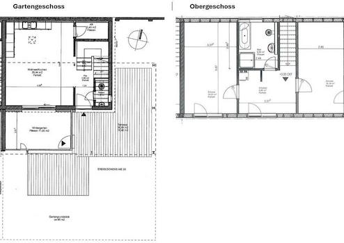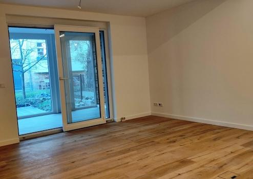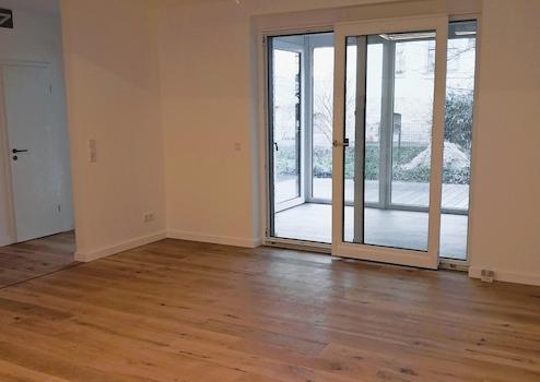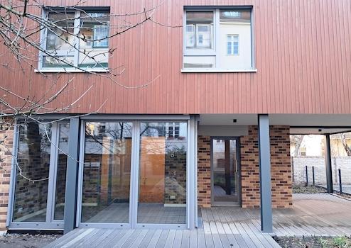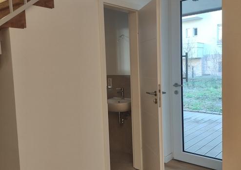 Das rechte Haus (WE 25) erstreckt sich über zwei Etagen: Im Gartengeschoss befindet sich der offene Wohn- und Essbereich mit vorinstallierten Küchenanschlüssen. Daran schließt sich der hochwertige Wintergarten an, ausgestattet mit Fußbodenheizung und allen Medienanschlüssen. Über den Wintergarten gelangt man über 2 Möglichkeiten zu Terrasse und Garten. Der Garten wird mit Rasen und Hecke bepflanzt. Ein Obstbaum und eine Magnolie stehen bereits.