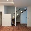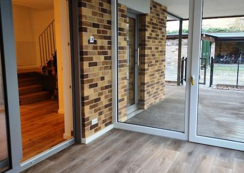 Eine Gäste-Toilette im Eingangsbereich ergänzt den Grundriss. Die großen bodentiefen Fenster sowie ein Dachfenster über der Küche sorgen für Tageslicht und Luftzirkulation.