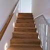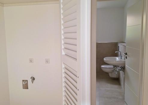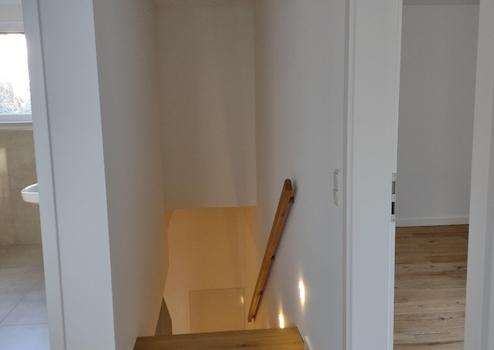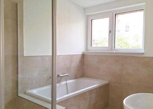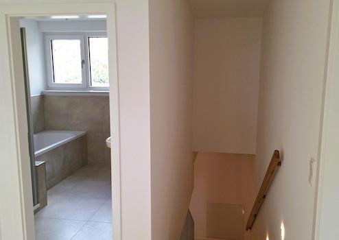Im Obergeschoss befinden sich die beiden Schlafzimmer, ein modernes Fensterbad mit Badewanne und Dusche, sowie ein Hauswirtschaftsraum mit Anschluss für Waschmaschine und Trockner und weiteren Verstauungsmöglichkeiten