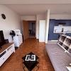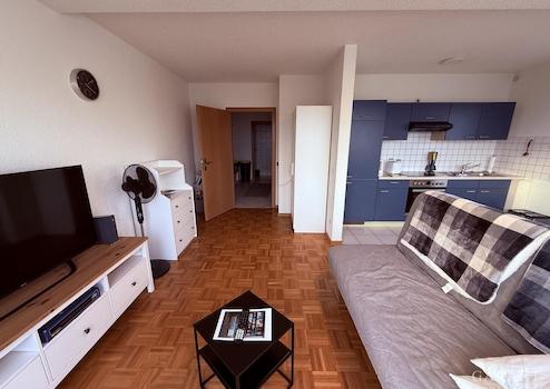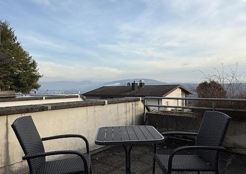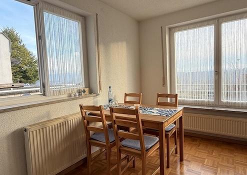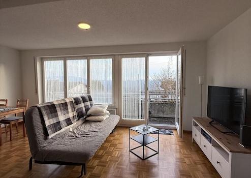 Vom Wohnzimmer gelangen Sie direkt auf den Balkon und den privaten Freisitz, von wo Sie je nach Wetterlage tolle Alpensicht, Ruhe und Entspannung genießen können.
