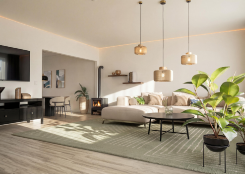 Ein praktischer Hauswirtschaftsraum mit Waschmöglichkeiten, ein modern ausgestattetes Badezimmer, der Technikraum mit effizienter Pelletheizung sowie zwei vielseitig nutzbare Zimmer bieten zahlreiche Nutzungsmöglichkeiten – ob als Homeoffice, Gästezimmer oder persönlicher Rückzugsort für Hobby und Freizeit. Über das zentrale Treppenhaus gelangen Sie in das obere Wohngeschoss, das als Herzstück des Hauses dient. Der großzügige Wohnbereich empfängt Sie mit hellen, freundlichen Räumen und einem gemütlichen Schwedenofen, der an kühlen Tagen wohlige Wärme und eine einladende Atmosphäre schafft. Direkt anschließend befindet sich die offen gestaltete Designerküche der Marke Schüller.