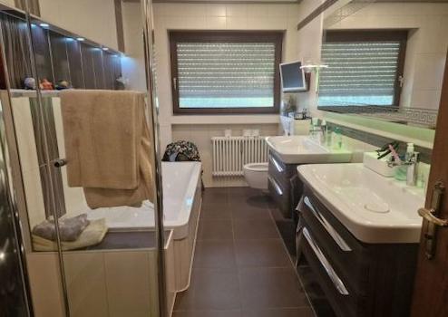 Bad mit Wanne, ebenerdiger Dusche + WC und 2 Waschbecken, Schlafzimmer (PVC), großer Balkon (Fliesen), riesige Terrasse mit Markise,