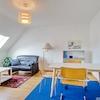 On the gallery level is a large, open-plan room with large roof windows and Velux roof balcony, meaning it is light and airy in summer. As well as the home office area with desk and chair, there is an additional seating area with sofa and two wicker chairs, where you can enjoy cable TV.