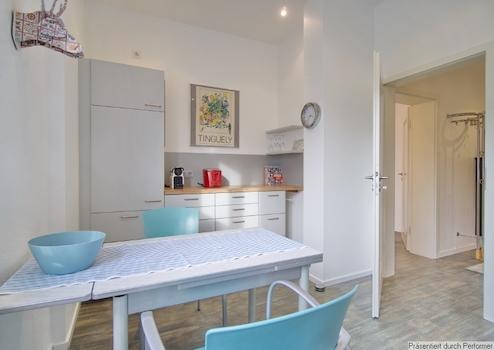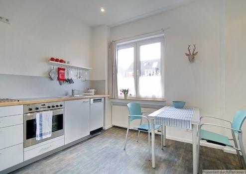 In der Einbauküche befindet sich eine Spülmaschine, es gibt einen Esstisch für 2 Personen, Nespresso-Kaffeemaschine, Toaster und Wasserkocher.